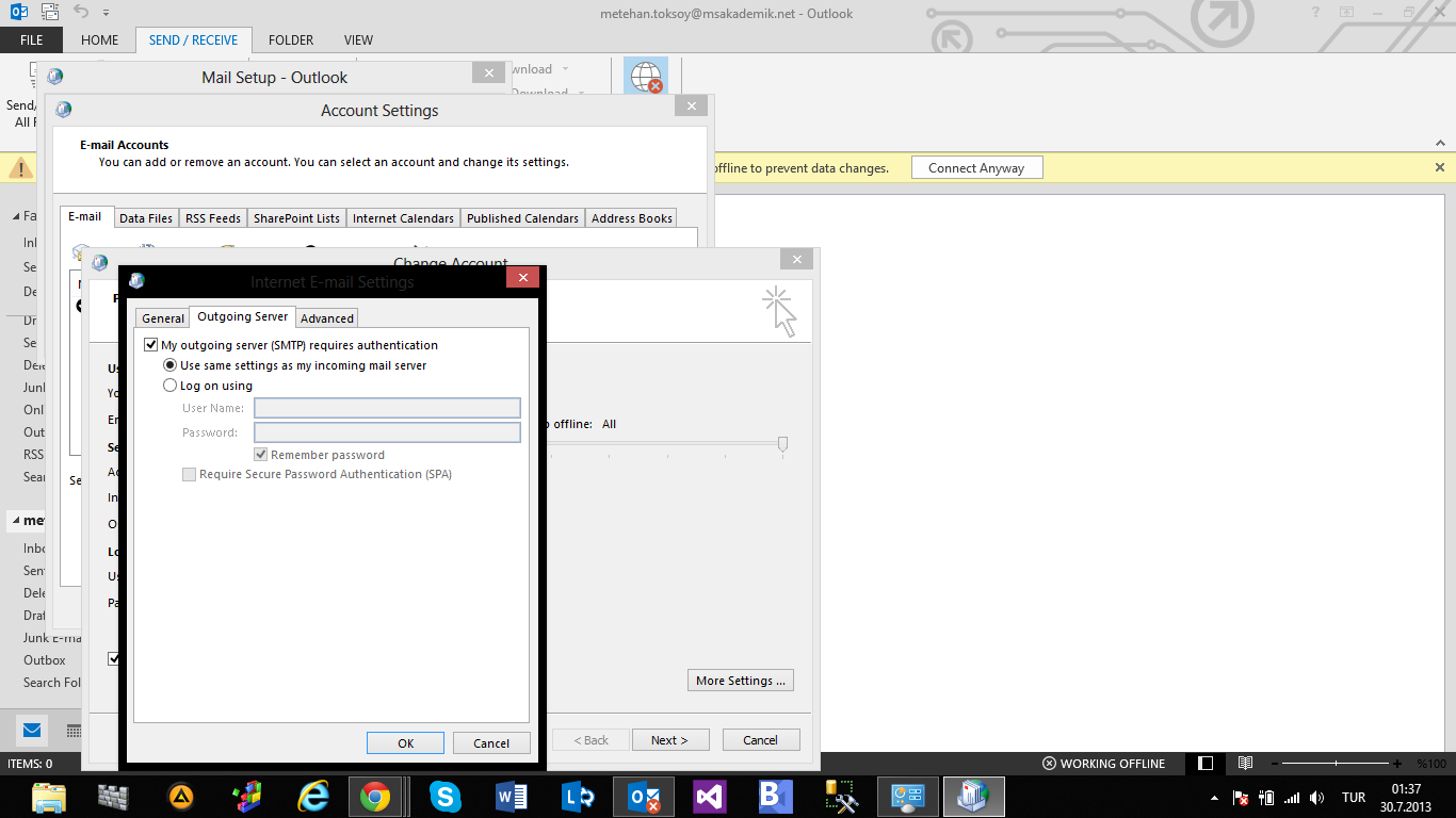 Previous Image Next Image 8 “My outgoing server (SMTP) requires authentication”seçeneğini seçin. Ardından “Use same settings as my incoming mail server” seçeniğini seçip “Advanced” sekmesine geçin.