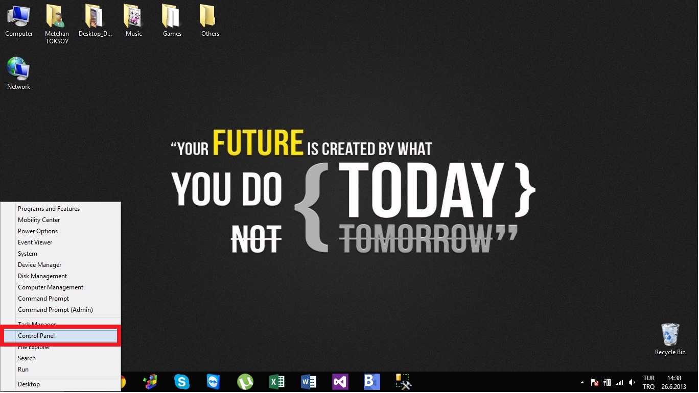 Previous Image Next Image 1 Ekranın sol altına sağ tık yapın. Açılan menüde “Control Panel” – “Denetim Masası”na tıklayın.