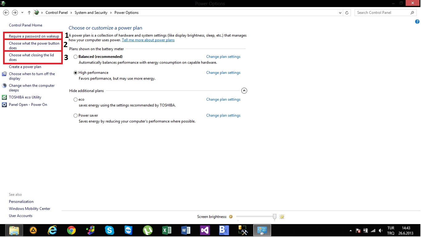 Tıklayacağınız 3 bağlantı da sizi ayarı yapacağınız sayfaya götürecektir. “Require a password on wakeup” – “Uyanırken parola gerektir” veya “Choose what the power button does” – “Güç düğmelerinin yapacaklarını seçin” veya “Choose what closing the lid does” – “Kapak kapatıldığında yapılacakları seçin”.