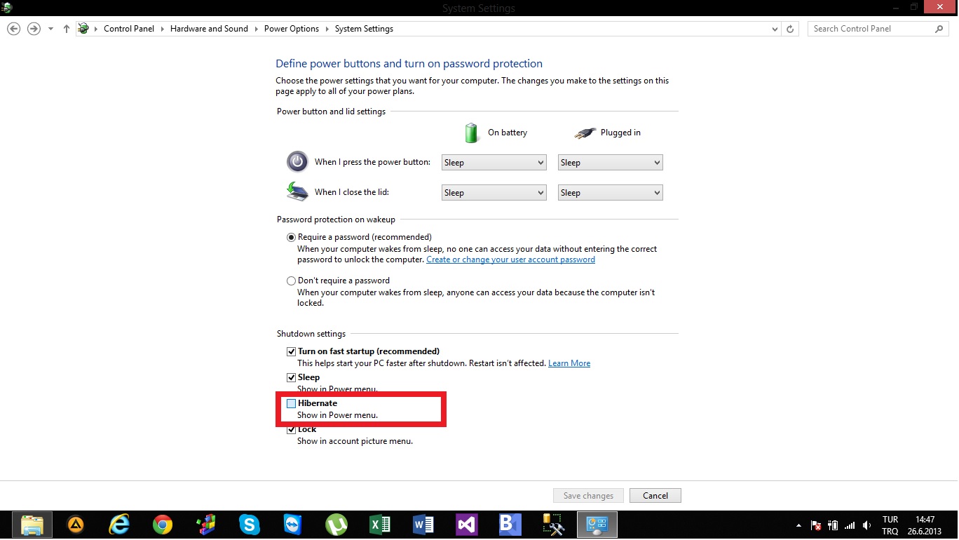 Aynı ekranda aşağıda bulunan “Shutdown settings” – “Kapatma ayarları”ndaki 4 seçeneğin aktifleştiğini göreceksiniz. “Hibernate” – “Hazırda Beklet” seçeneğini aktifleştirip “Save” – “Kaydet”e tıklayın.