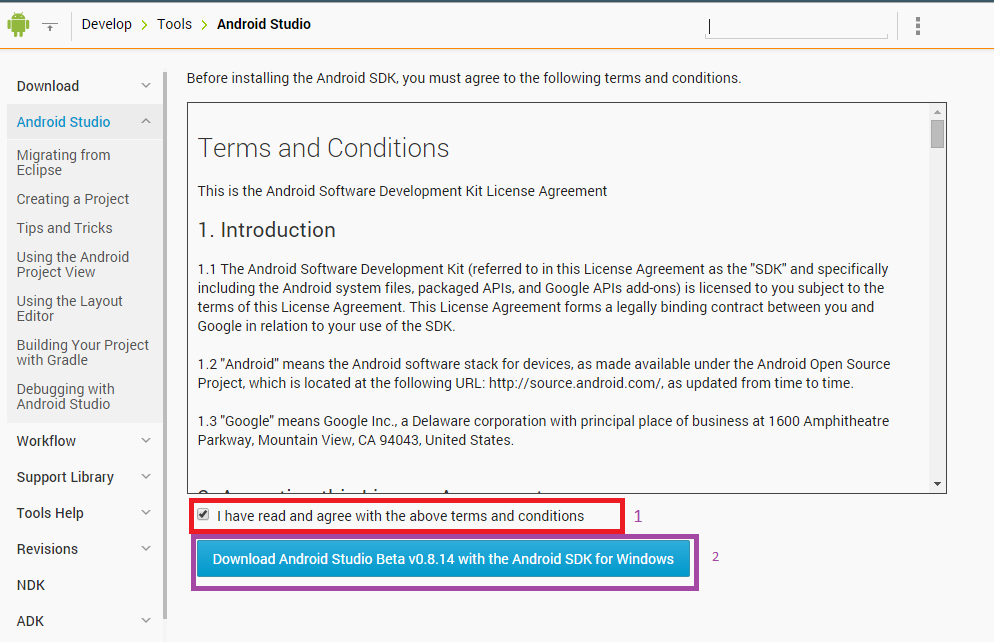 2-) Kullanıcı sözleşmenizi kabul edin ve “Download Android Studio Beta vX.x.xx” butonuna tıklayın.