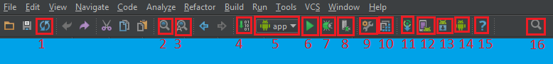 1) Synchronize: Proje dosyaları üzerinde Android Studio üzerinden değil başka bir program yardımıyla oynamış veya projenizde kullanmak üzere bir dosya eklemişseniz ve Android Studio kendisi senkronize etmemişse (otomatik senkronize etmektedir) senkronize edilmesini sağlar.