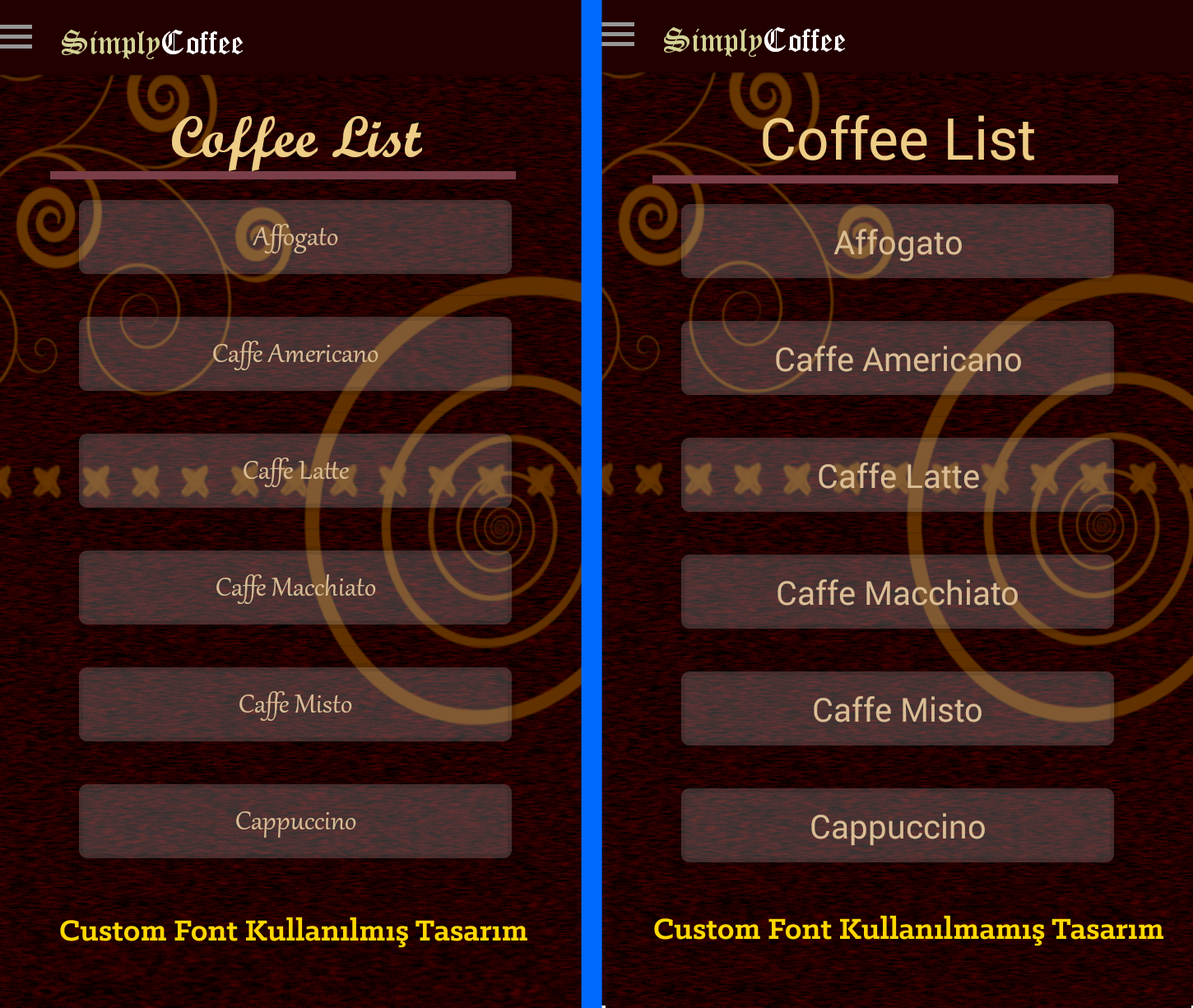 Font atamayı programsal olarak yapmamız mümkün. Yani arayüzden şu fontta olsun demeniz için Custom TextView’lar mevcut fakat eğer çok lazım değilse kullanmanıza pek gerek yok. Zira onlar da arka planda burada yazacağımız kodlarla çalışmaktadır.
